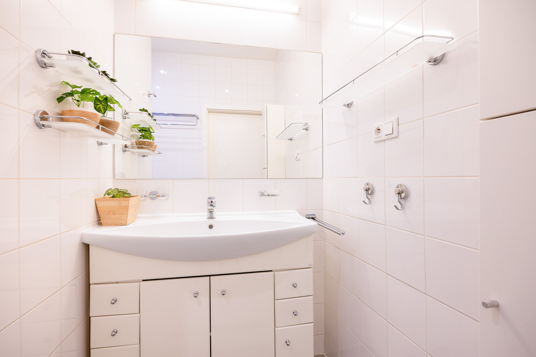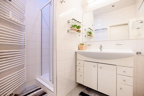 Koupelna se sprchovým koutem má výměru 3,9 m², toaleta je řešena samostatně a disponuje plochou 1,4 m². Prostorná předsíň o velikosti 8,2 m² poskytuje dostatek místa pro vestavěné úložné řešení.