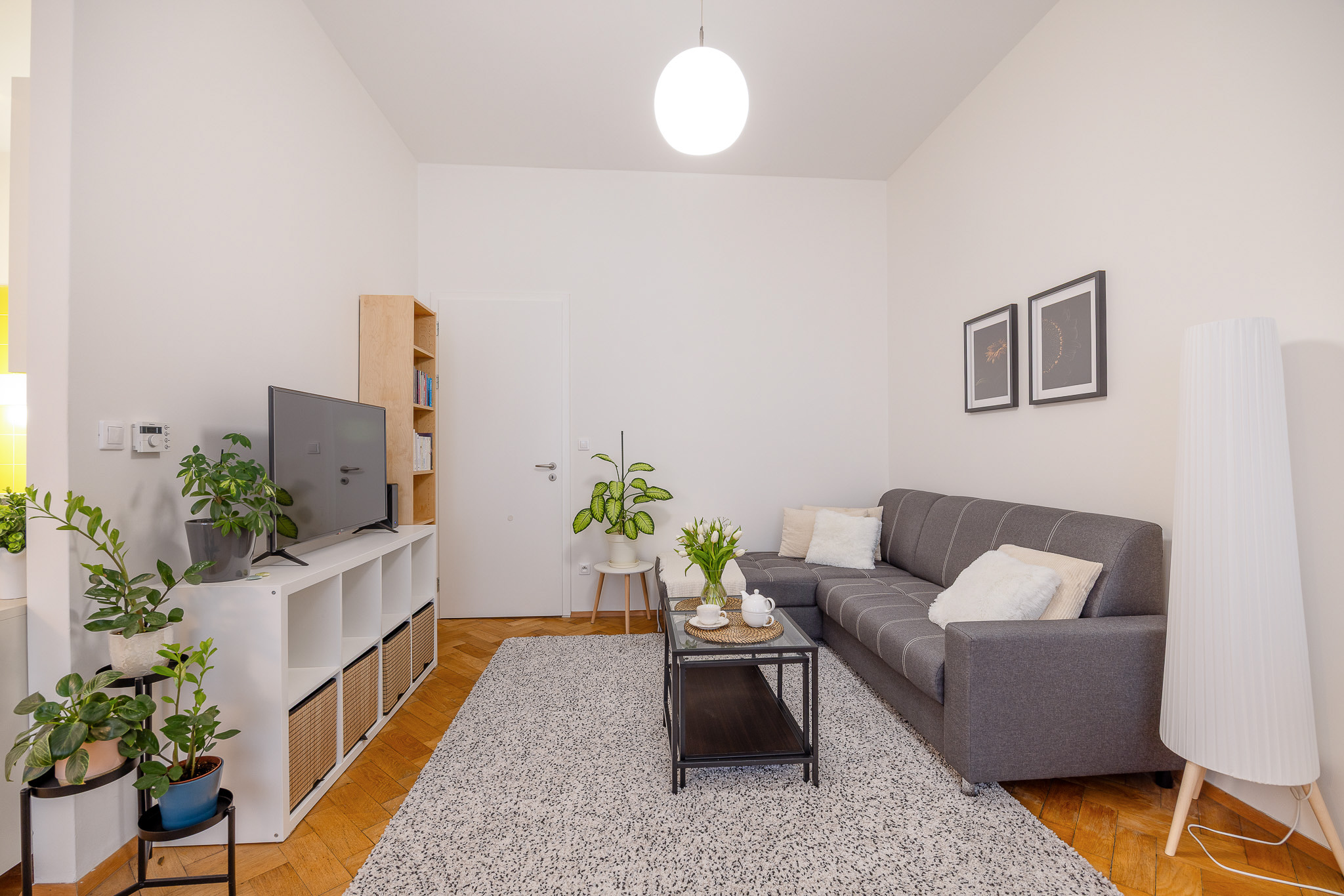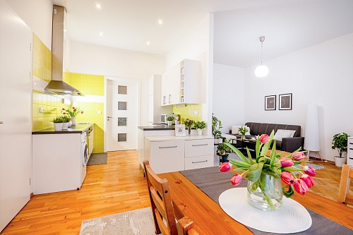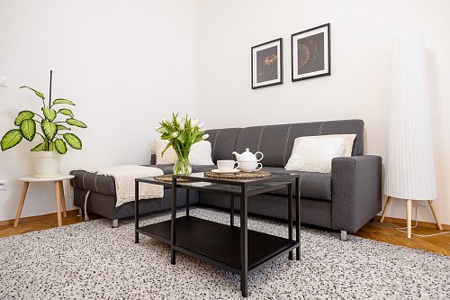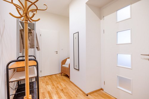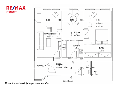 Celková plocha bytu včetně příslušenství činí 71,6 m². Dispozice je velmi dobře navržená a působí vzdušným, otevřeným dojmem. Dominantou bytu je obytný prostor s kuchyňským koutem o velikosti 14,9 m², který přirozeně navazuje na hlavní obytnou část o ploše 22,0 m². Druhý pokoj o výměře 21,2 m² slouží jako ložnice a jeho součástí je samostatný šatník, jenž výrazně zvyšuje komfort bydlení a nabízí dostatek úložného prostoru bez nutnosti dalších skříní v interiéru.