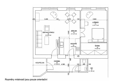 Celková plocha bytu včetně příslušenství činí 71,6 m². Dispozice je velmi dobře navržená a působí vzdušným, příjemným dojmem. Dominantou bytu je obytný prostor s kuchyňským koutem o velikosti 14,9 m², který přirozeně navazuje na hlavní obytnou část o ploše 22,0 m². Druhý pokoj o výměře 21,2 m² slouží jako ložnice a jeho součástí je samostatný šatník, jenž výrazně zvyšuje komfort bydlení a nabízí dostatek úložného prostoru bez nutnosti dalšího úložného nábytku v interiéru.