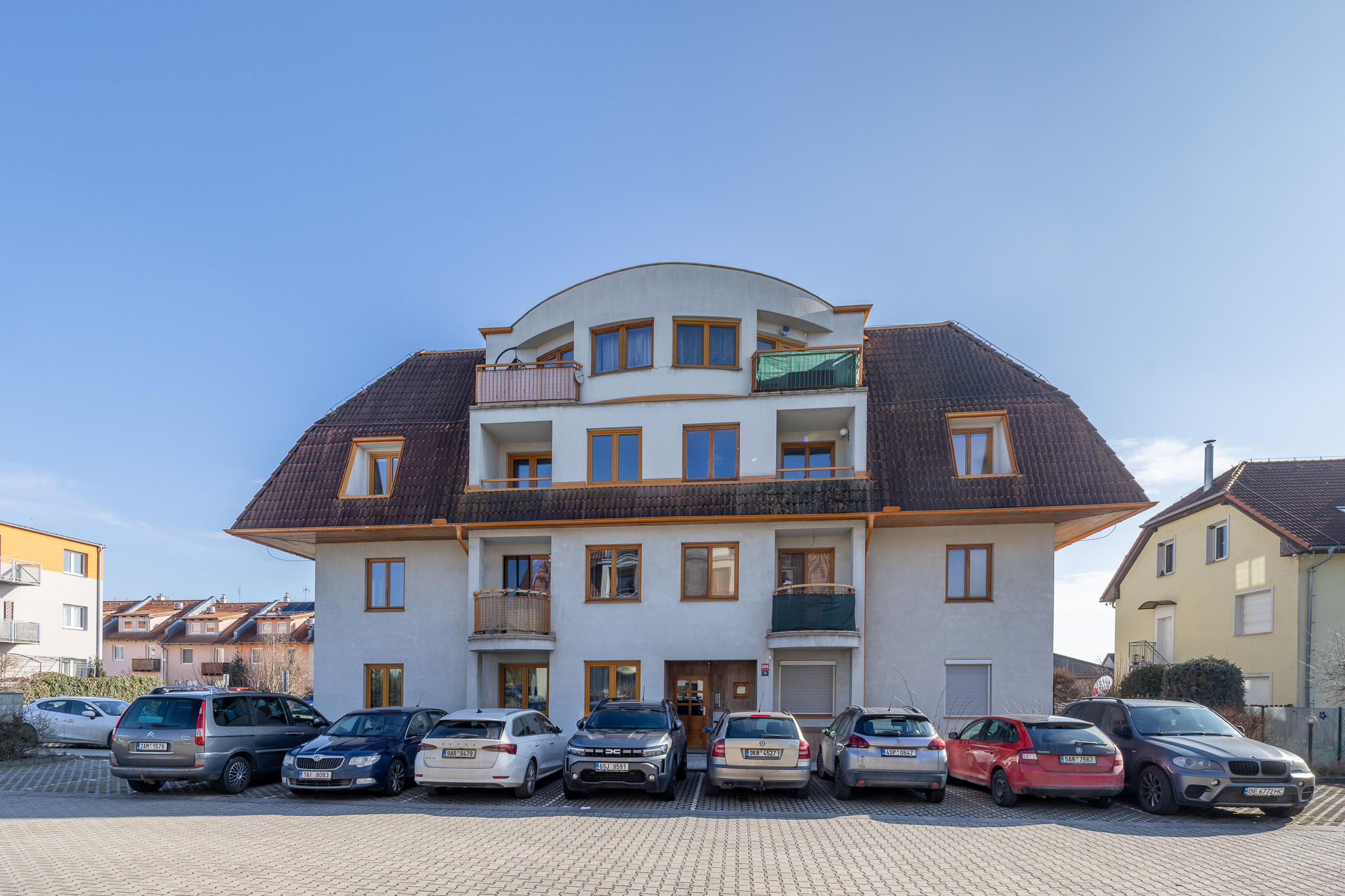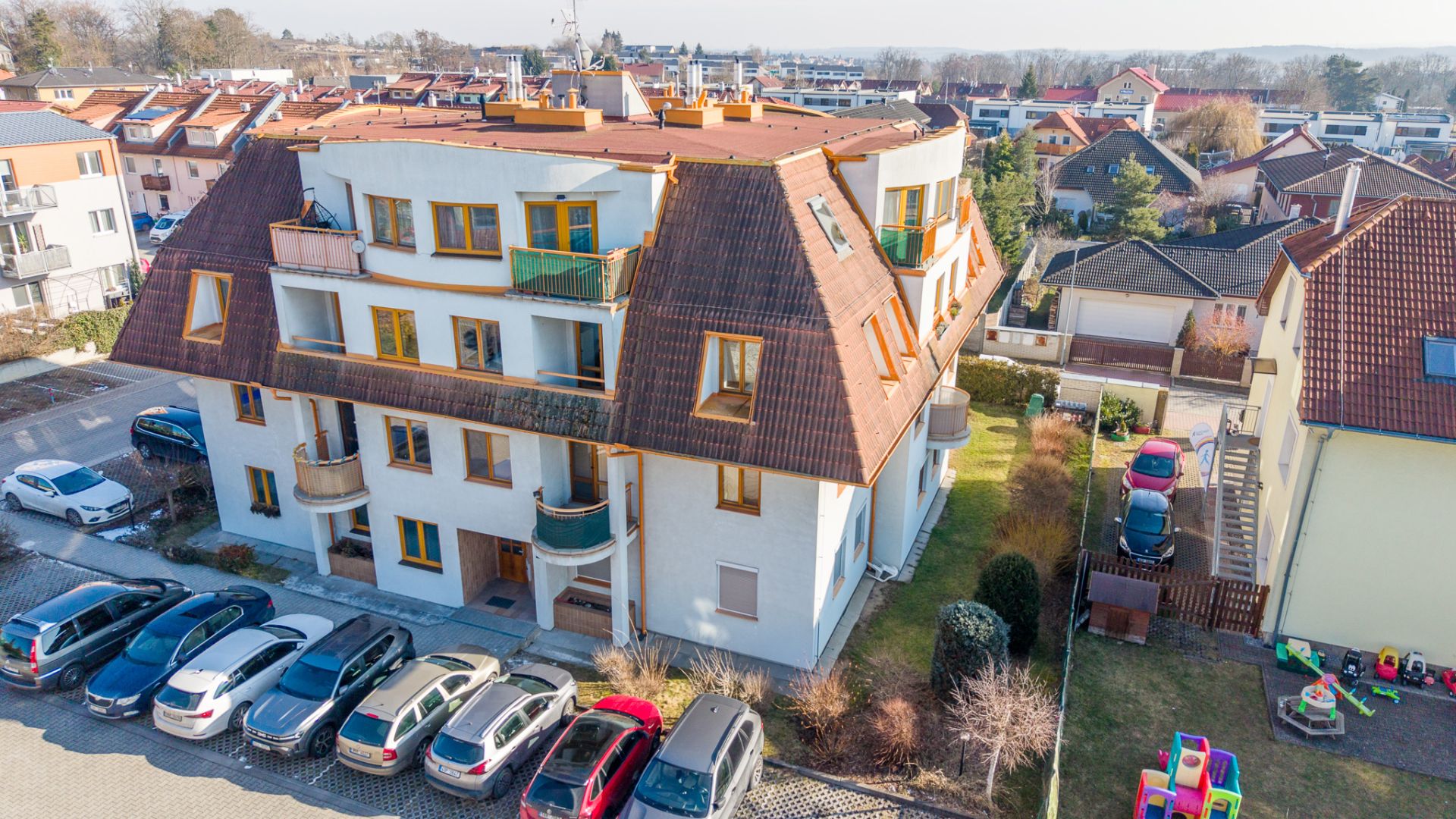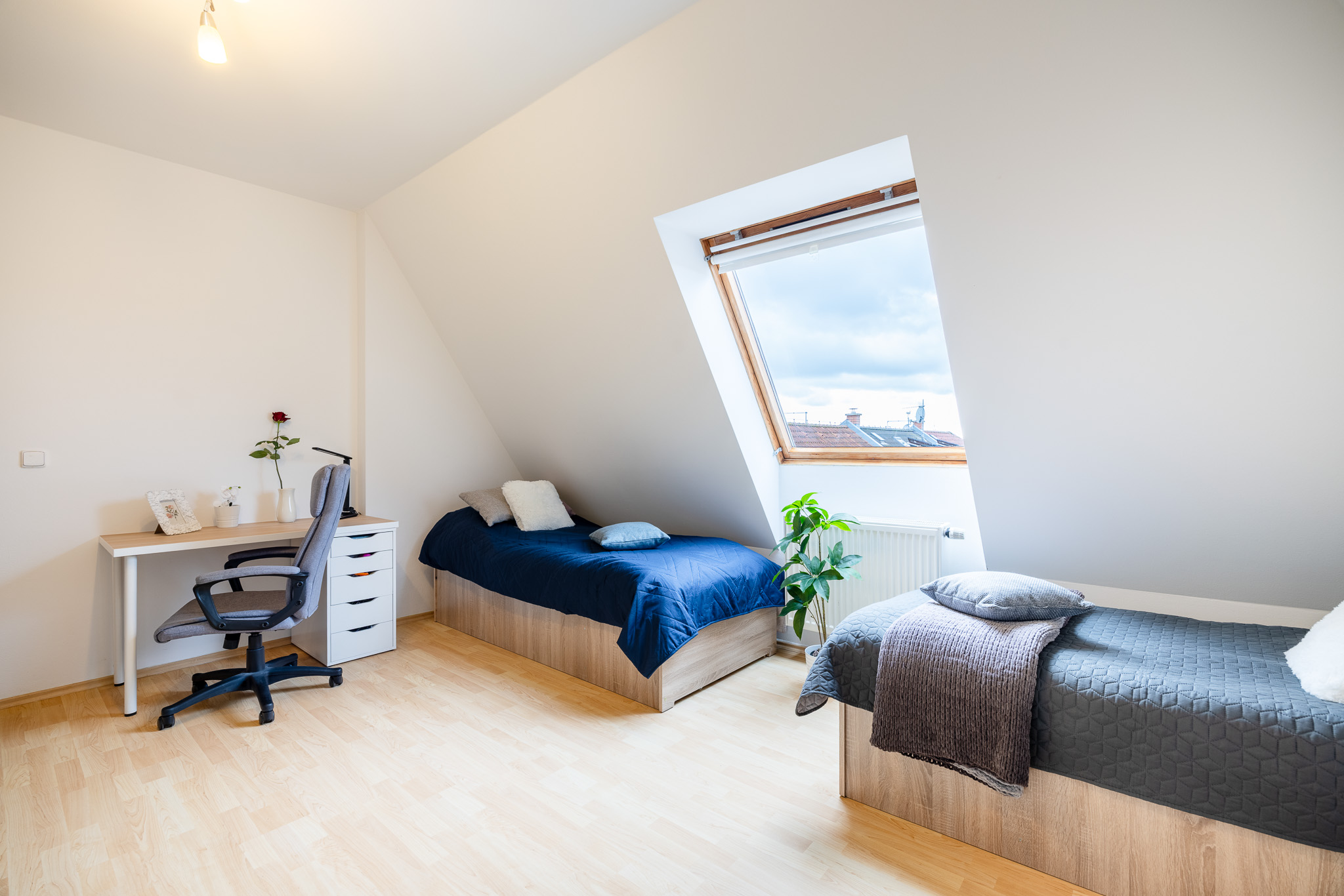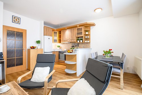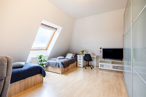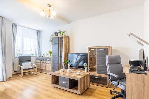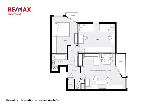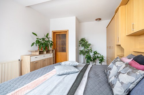 Dispozičně je byt řešen velmi prakticky. Obývací pokoj s kuchyňskou linkou a vestavnými spotřebiči tvoří přirozené centrum bytu – místo, kde se potkává každodenní život. Dvě samostatné ložnice nabídnou dostatek soukromí, ať už pro rodinu, pár nebo práci z domova. Nechybí koupelna s vanou, samostatná toaleta ani technická místnost se skladovacím prostorem, který v bytě vždy potěší. Byt je světlý a díky dvěma balkonům se v létě nabízí příjemné posezení s orientací na jiho a severozápad – ideální třeba na večerní kávu nebo sklenku vína.