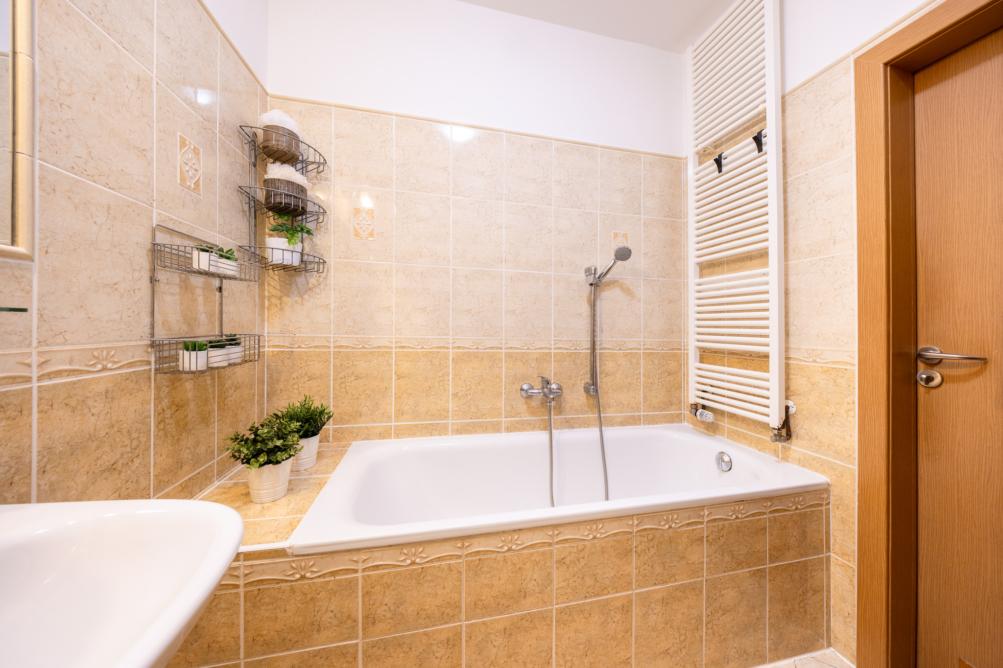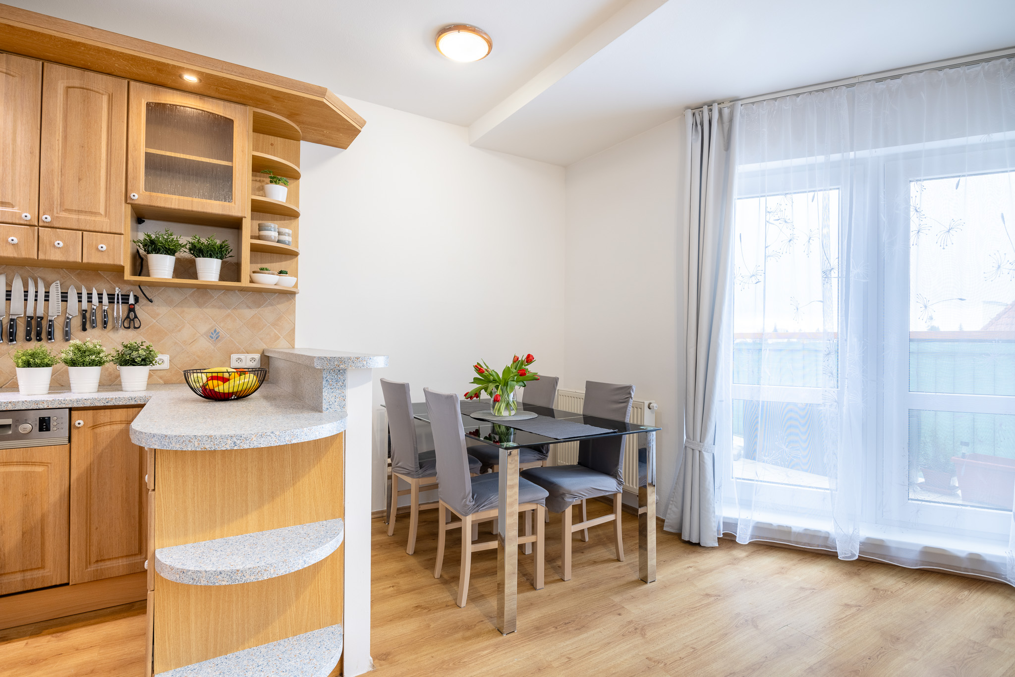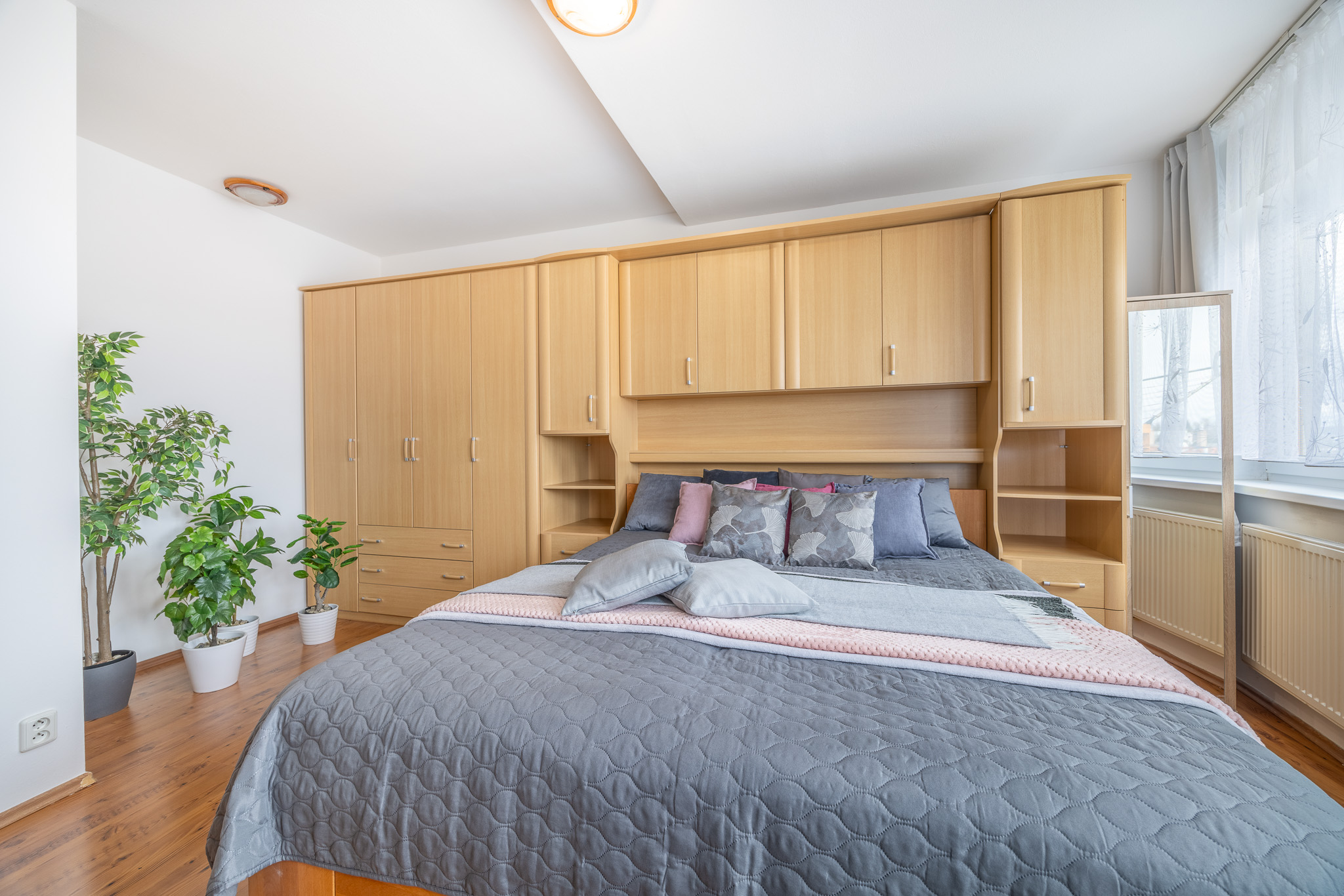 Dispozičně je byt řešen velmi prakticky. Obývací pokoj s kuchyňskou linkou a vestavnými spotřebiči tvoří přirozené centrum bytu – místo, kde se potkává každodenní život. Dvě samostatné ložnice nabídnou dostatek soukromí, ať už pro rodinu, pár nebo práci z domova. Nechybí koupelna s vanou, samostatná toaleta ani technická místnost se skladovacím prostorem, který v bytě vždy potěší. Byt je světlý a díky dvěma balkonům se v létě nabízí příjemné posezení s orientací na jiho a severozápad – ideální třeba na večerní kávu nebo sklenku vína.
